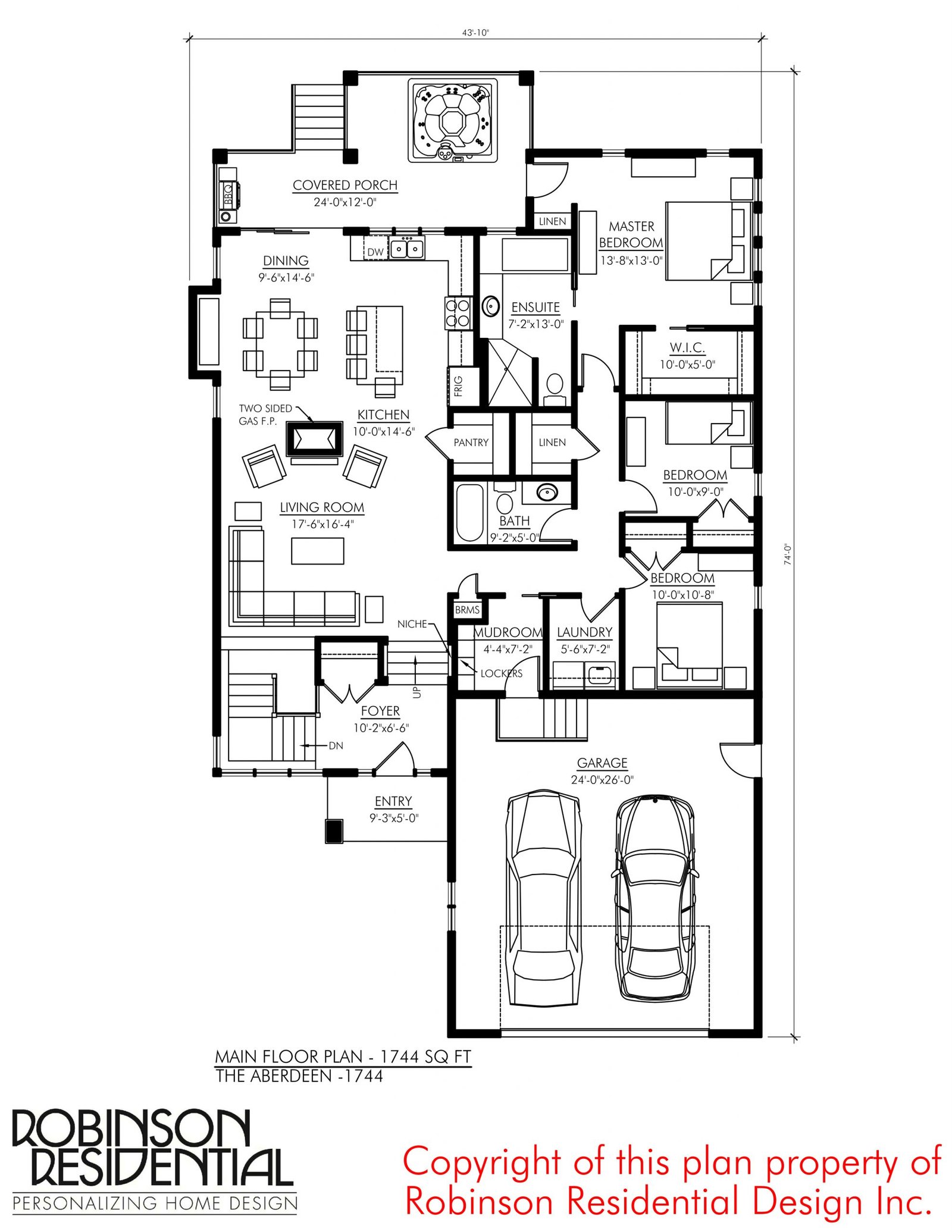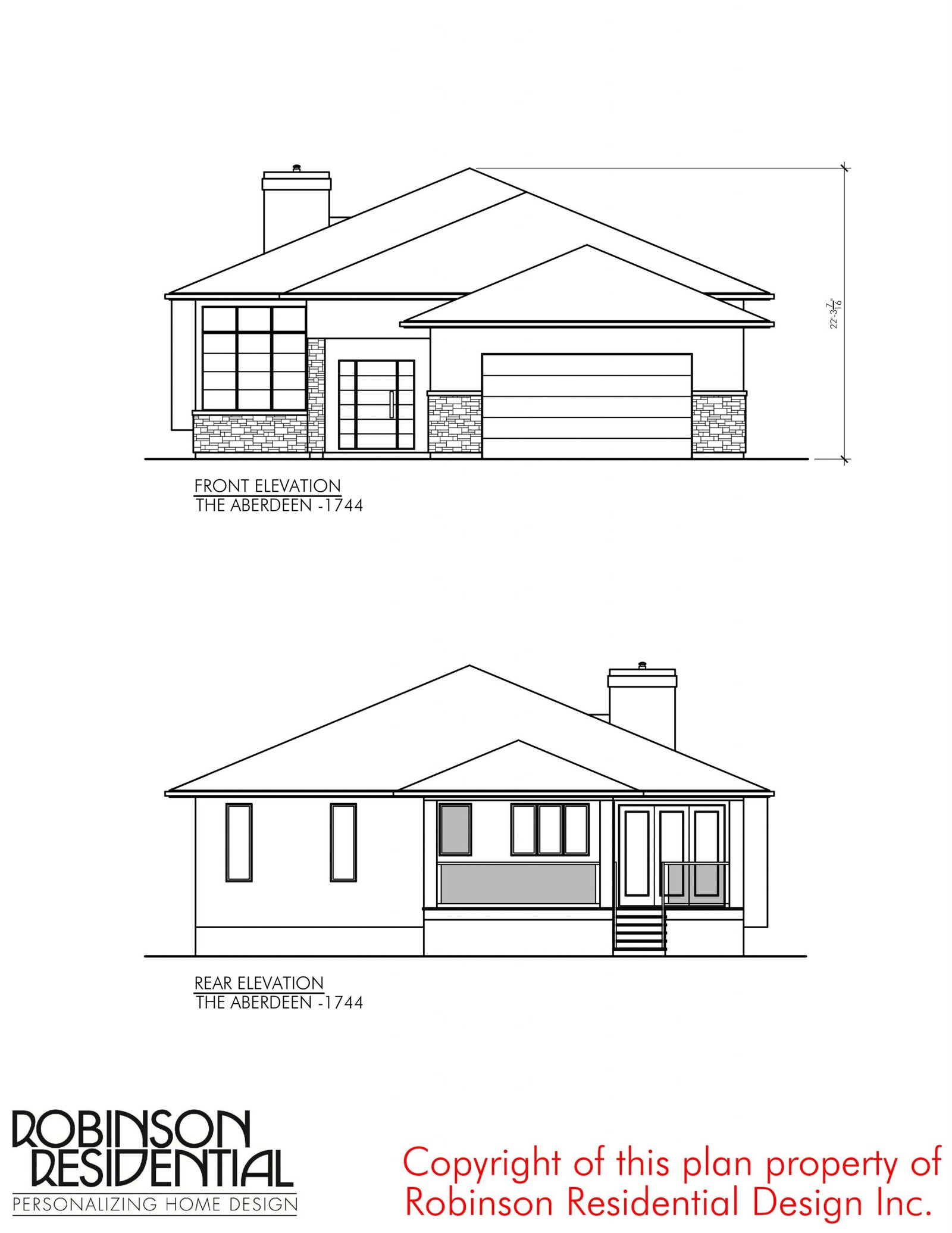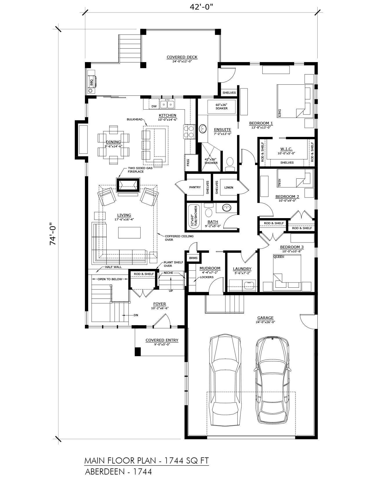 The Contemporary Aberdeen-1744 is a spacious bungalow, which includes an open concept living space divided by a two sided fireplace.  This contemporary plan features: