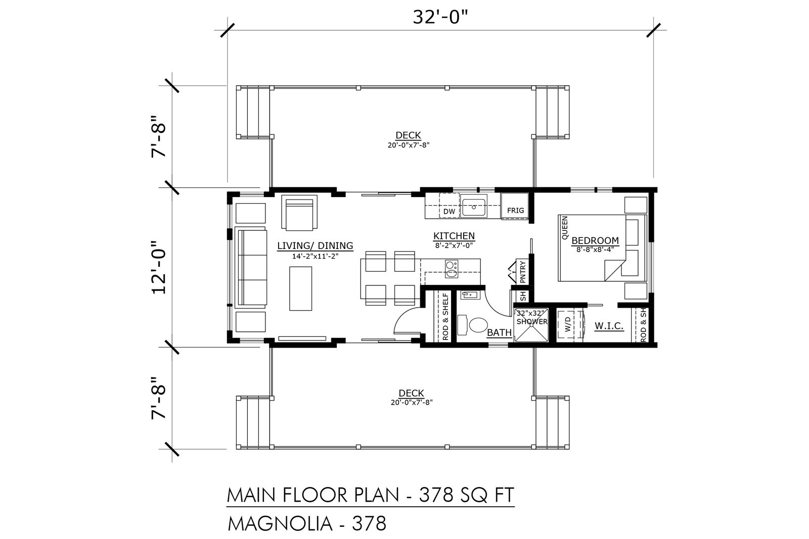 The Magnolia-378 is a contemporary style small house plan. It is designed to appeal to individuals who may find the constraints of a true “tiny house” too limiting. It can be placed on a foundation or left on a trailer, built off-site and moved to its final destination. This plan also can be modified for wheelchair accessibility. The 378 sq. ft. includes: