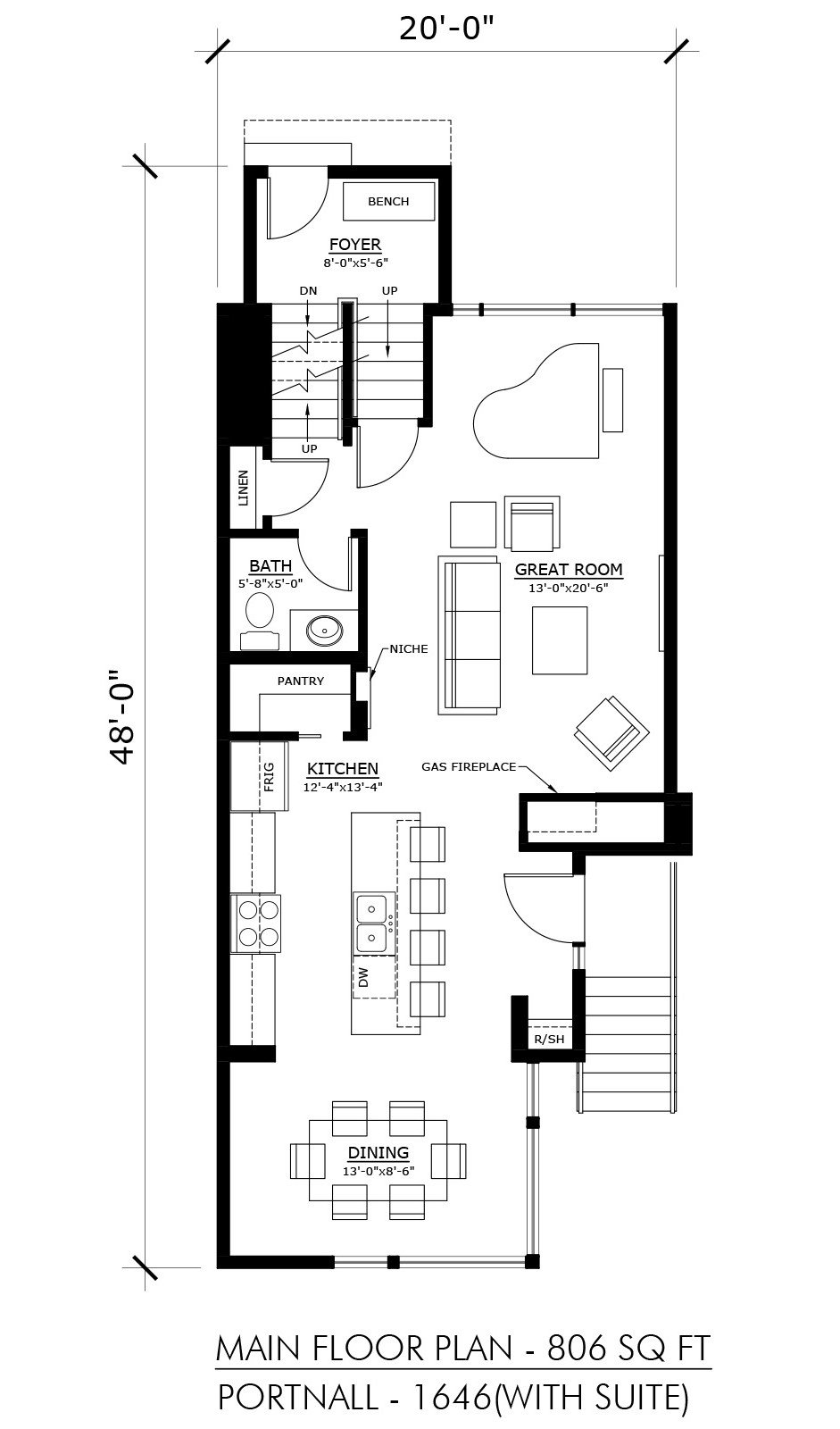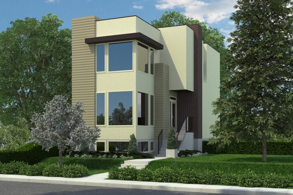 The Contemporary Portnall-1646SS is a 2-storey family home with a fully developed basement secondary suite, suited for narrow lot.  The exterior uses a combination of brick, horizontal wood siding and acrylic stucco for an authentic modern look.  This contemporary plan features: