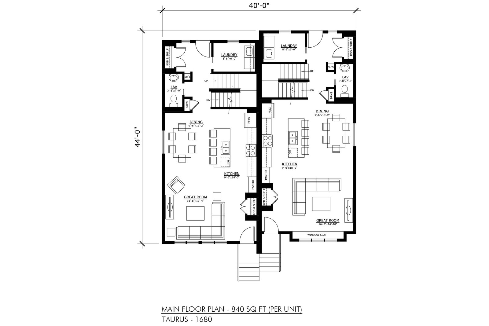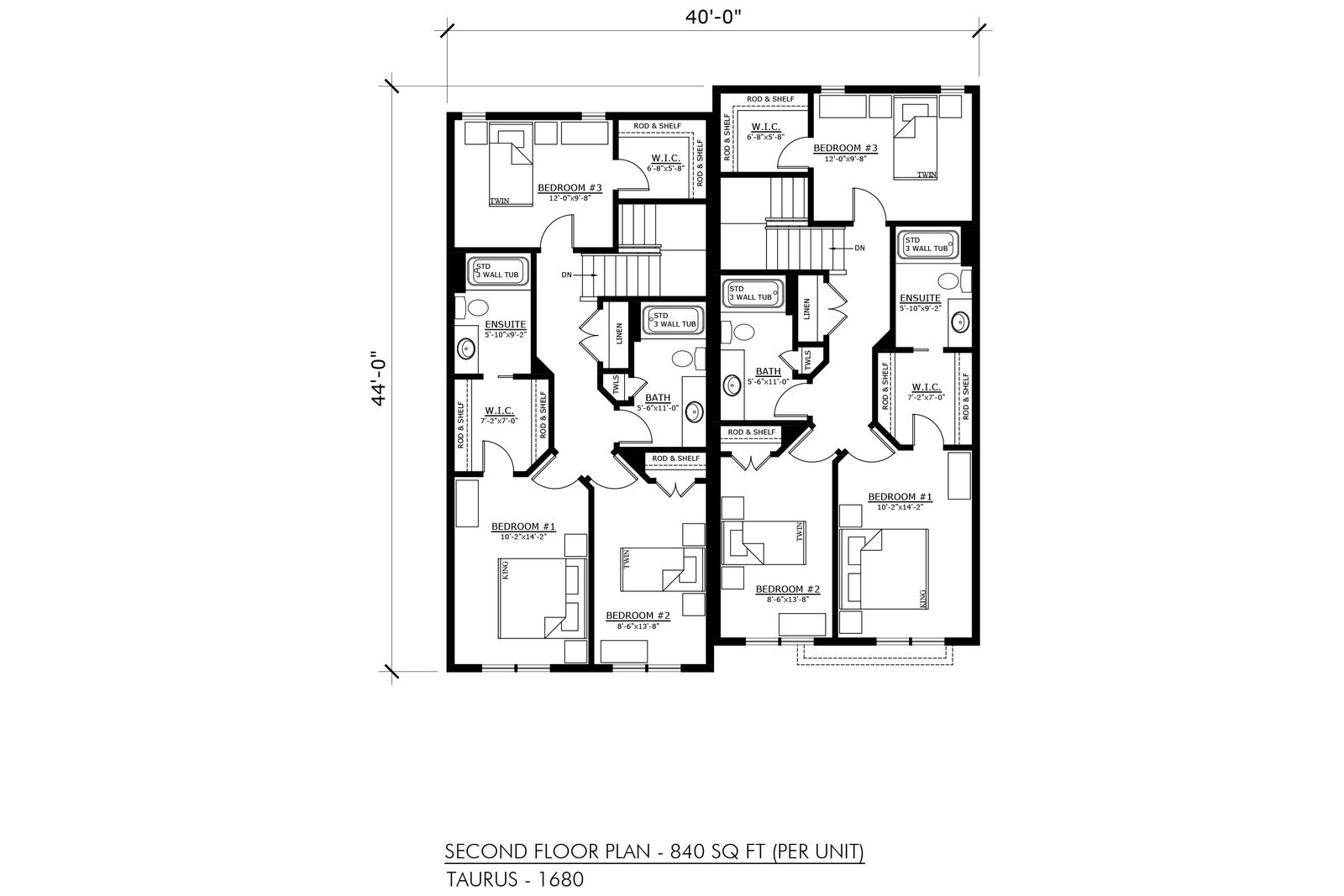 The Contemporary Taurus-1680 is a 2-storey semi-detached home. Each unit offers 1680 sq. ft. of living space.
