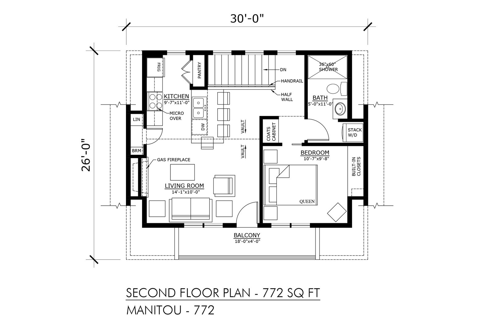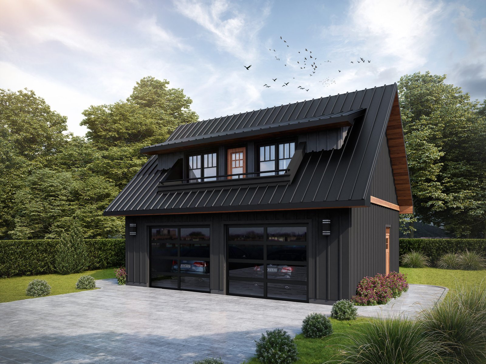 The Modern Farmhouse Manitou-772 plan is a garage studio/laneway home with a 2 car garage at grade level and living space on the second floor. This plan features: