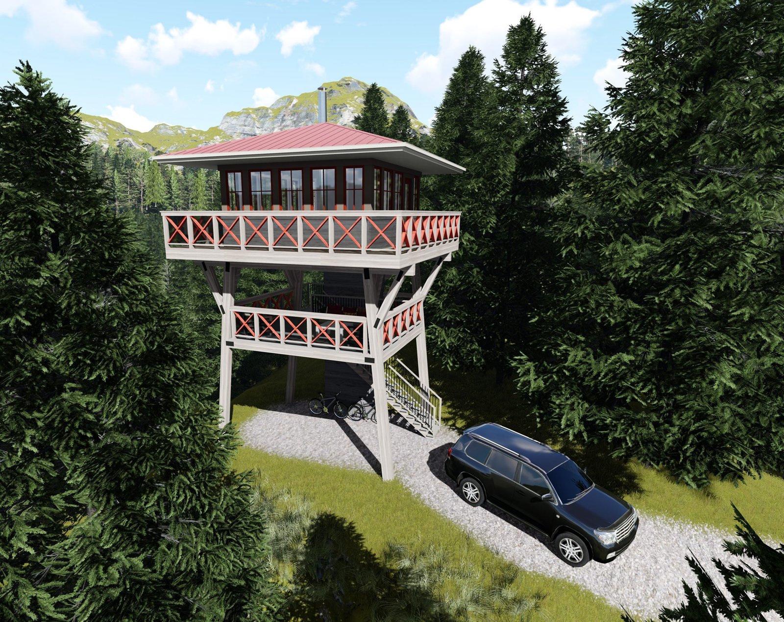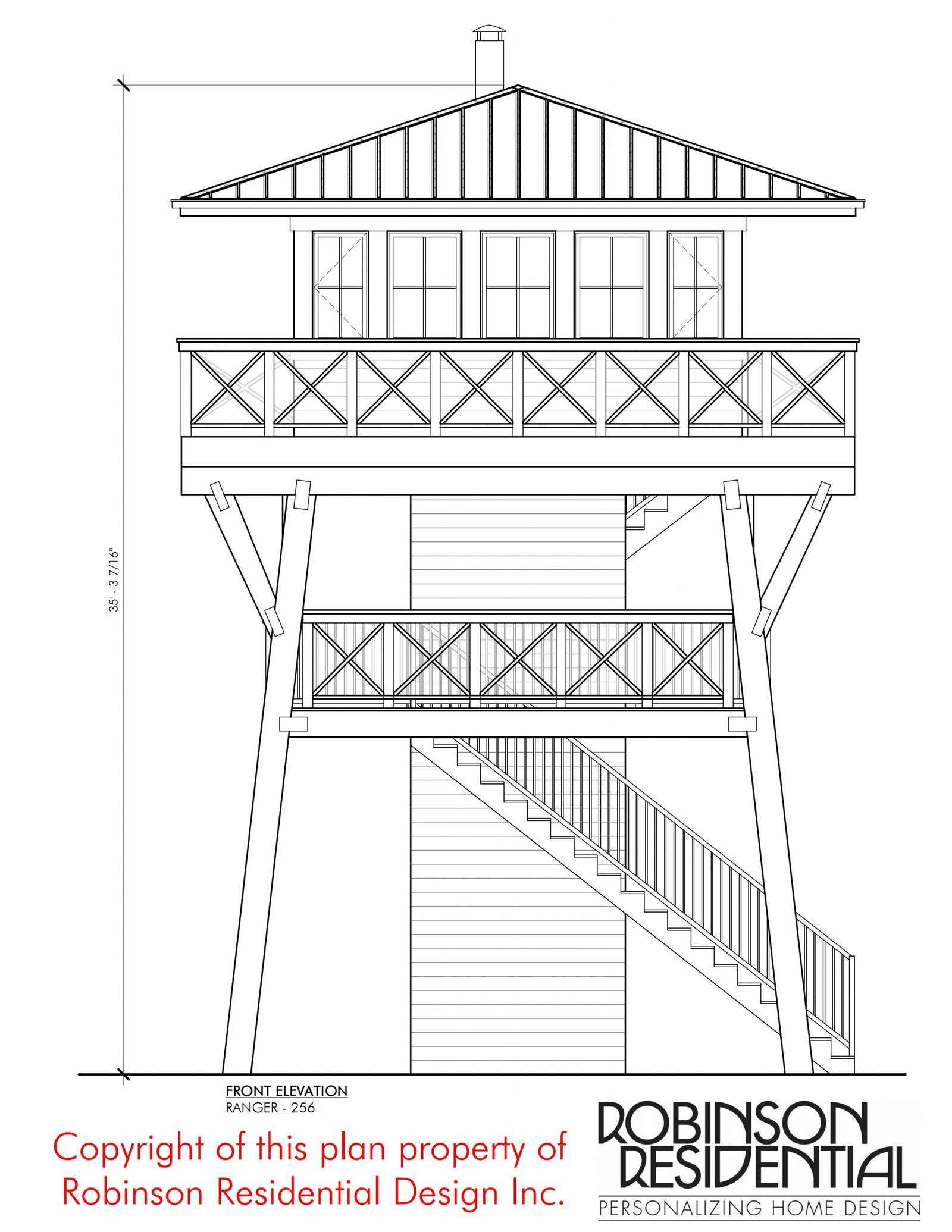 The unique Ranger-256 small home plan is inspired by the forest ranger lookout towers that were once a common sight in most park and forest areas. Staffed lookout towers began a century ago and reached their apex in the 1950s. They gradually declined to just a few hundred and technology such as aircraft and cameras replaced the towers.
