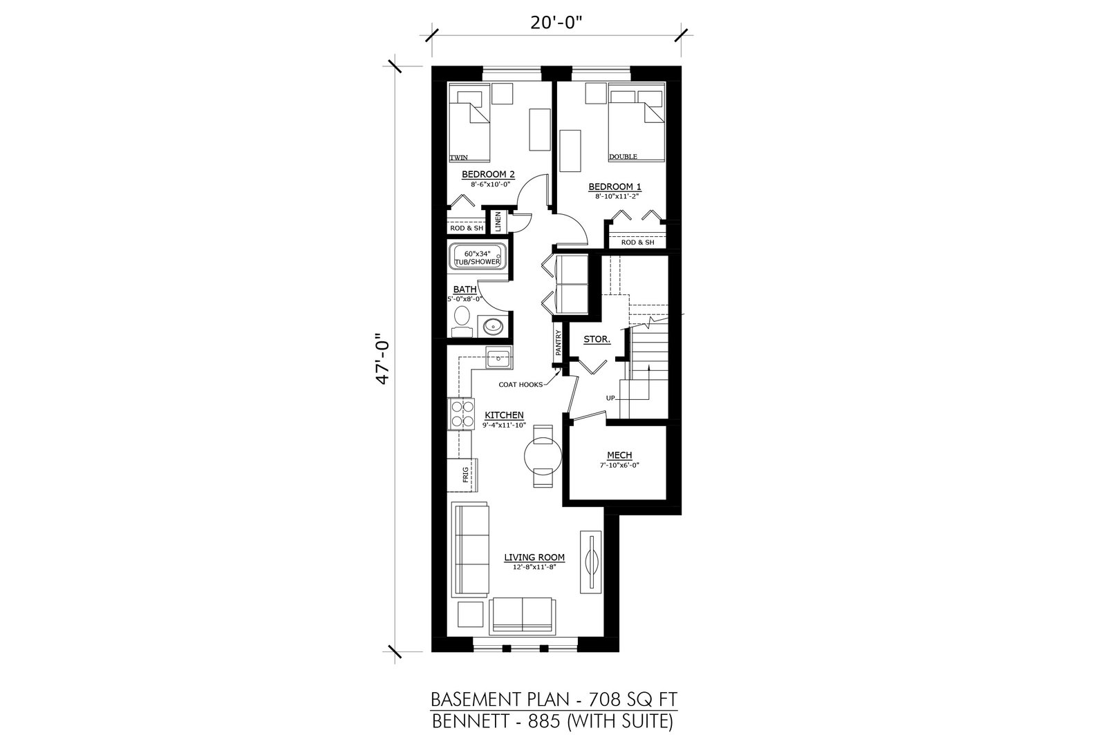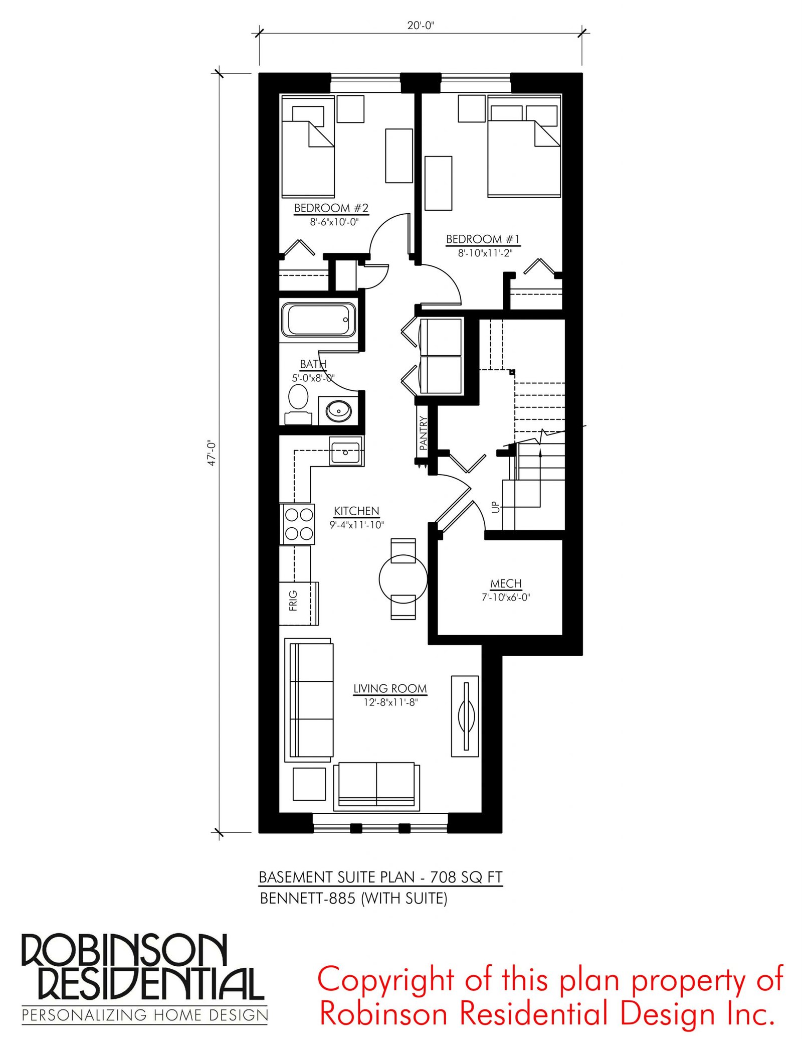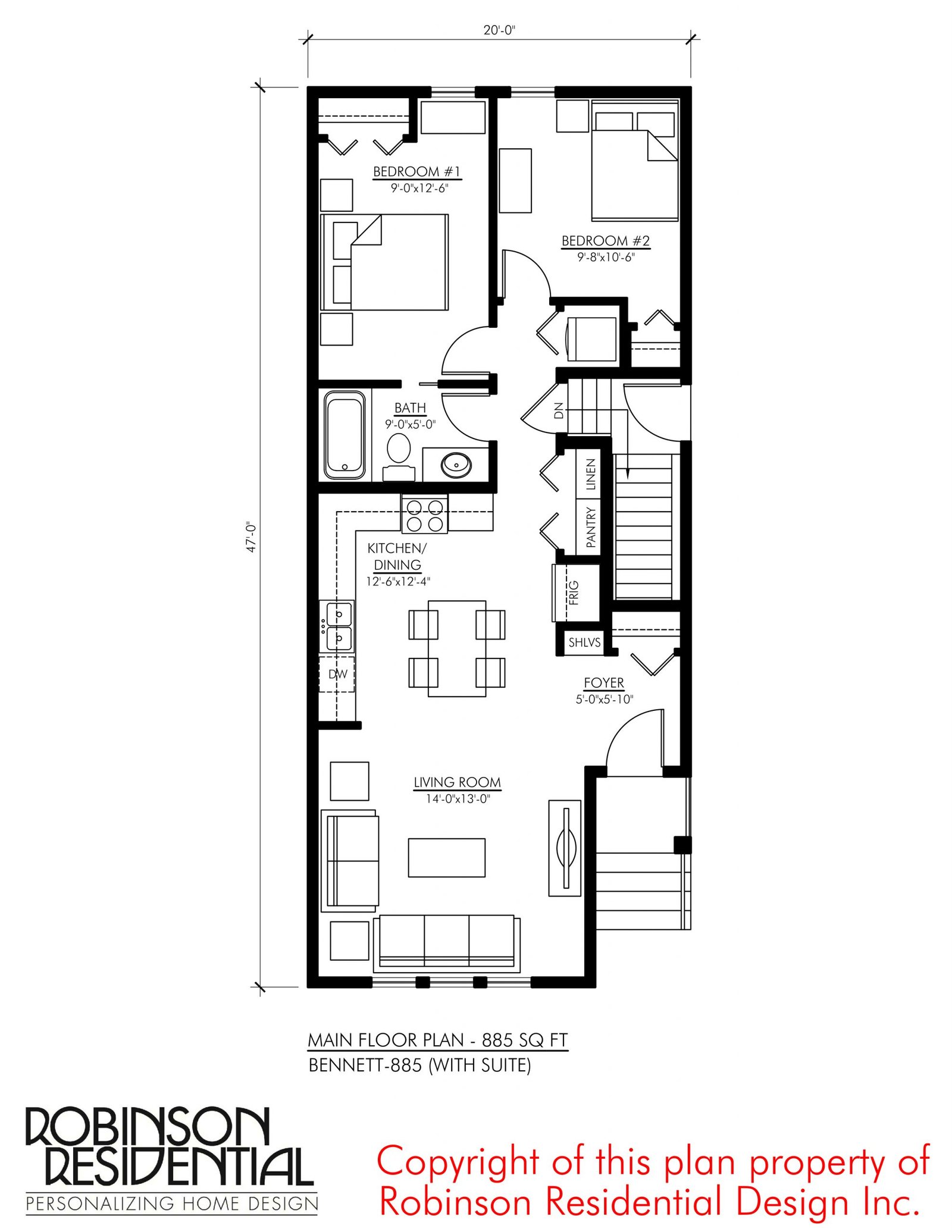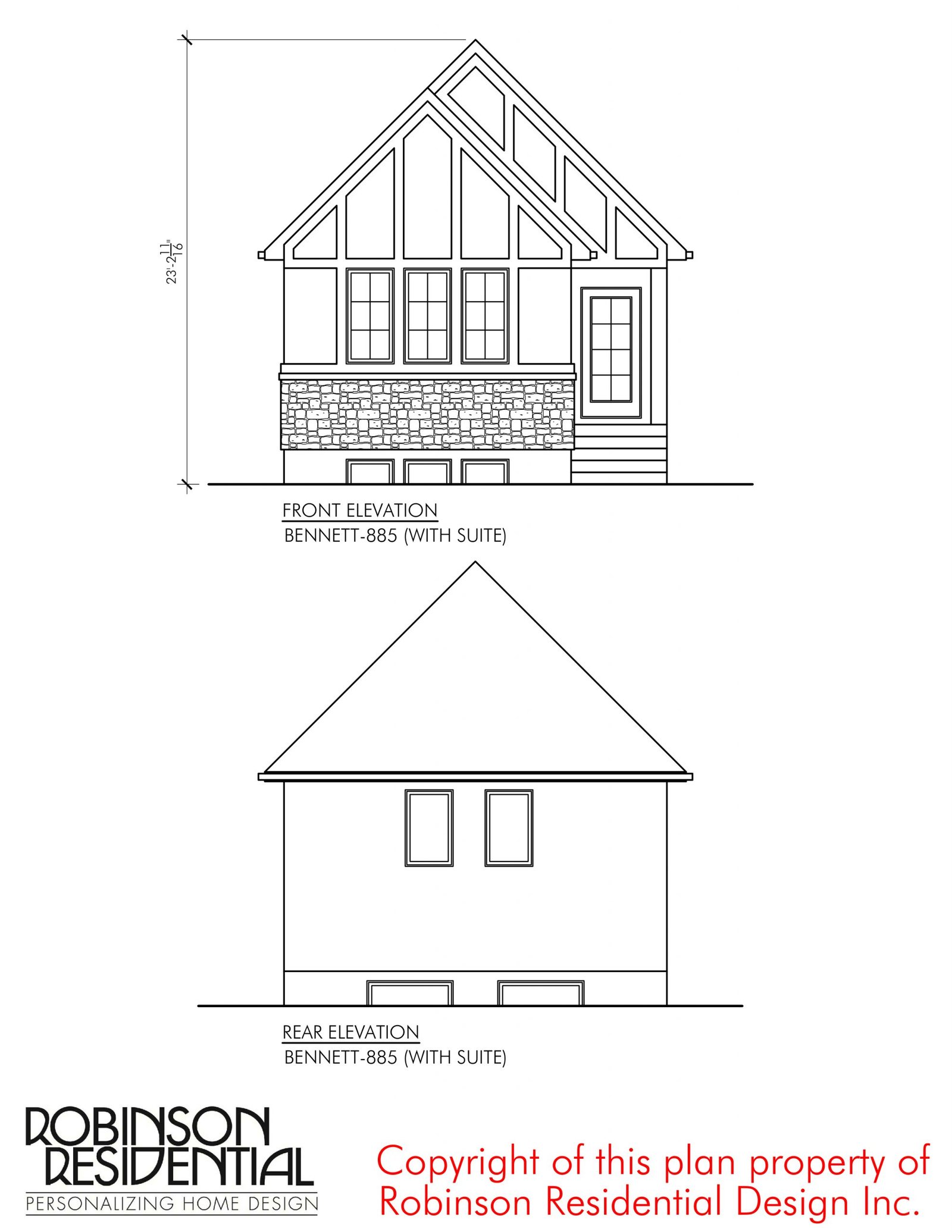 The Tudor Bennett-885 (with Suite) is a one storey home with a fully developed basement secondary suite, suited for a narrow lot.  This plan features: